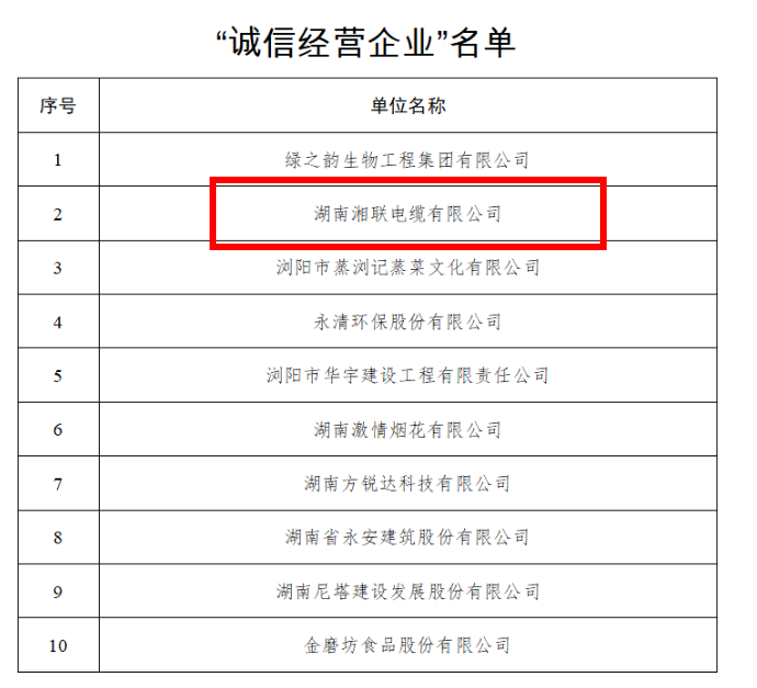 點(diǎn)贊!湘聯(lián)電纜獲評“誠信之星”!