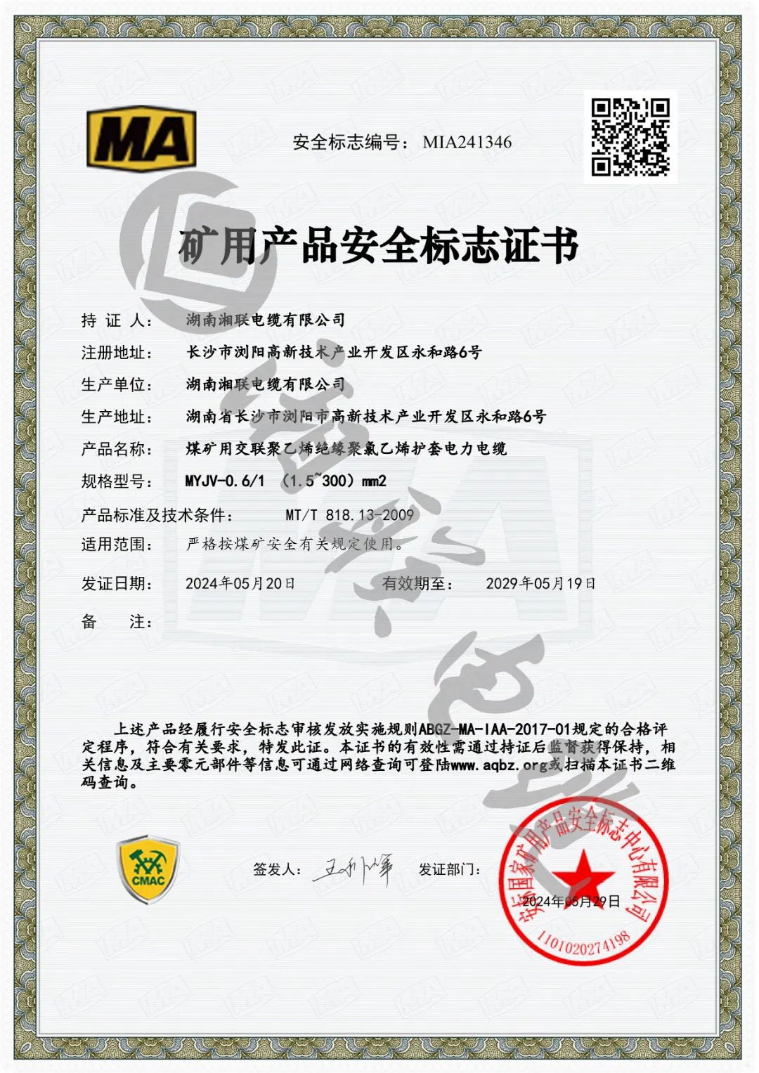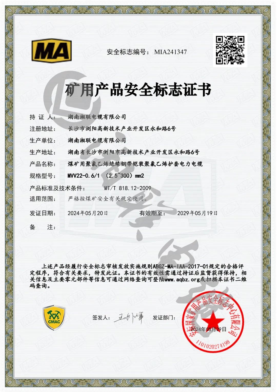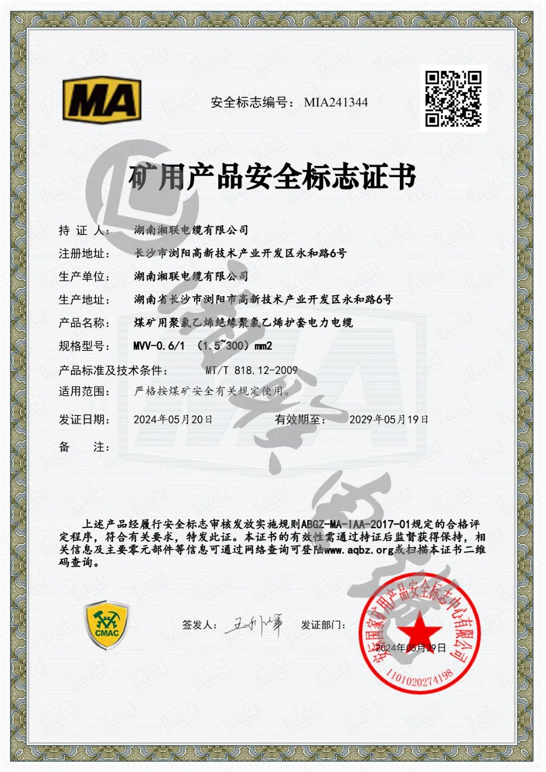 近日,湖南湘聯(lián)電纜有限公司成功取得安標(biāo)國家礦用產(chǎn)品安全標(biāo)志中心頒發(fā)MVV-0.6/1(1.5~300)mm2煤礦用聚氯乙烯絕緣聚氯乙烯護(hù)套電力電纜、MYJV-8.7/10(25~300)mm2煤礦用交聯(lián)聚乙烯絕緣聚氯乙烯護(hù)套電力電纜等六個(gè)產(chǎn)品的礦用產(chǎn)品安全標(biāo)志證書。