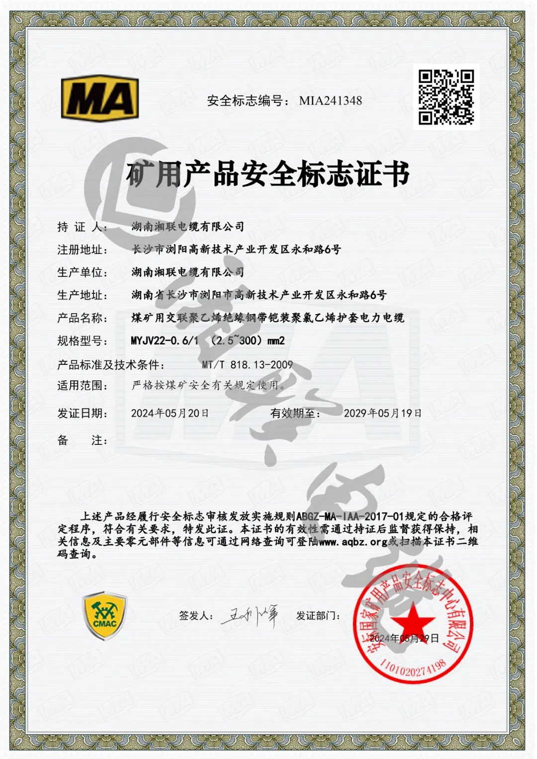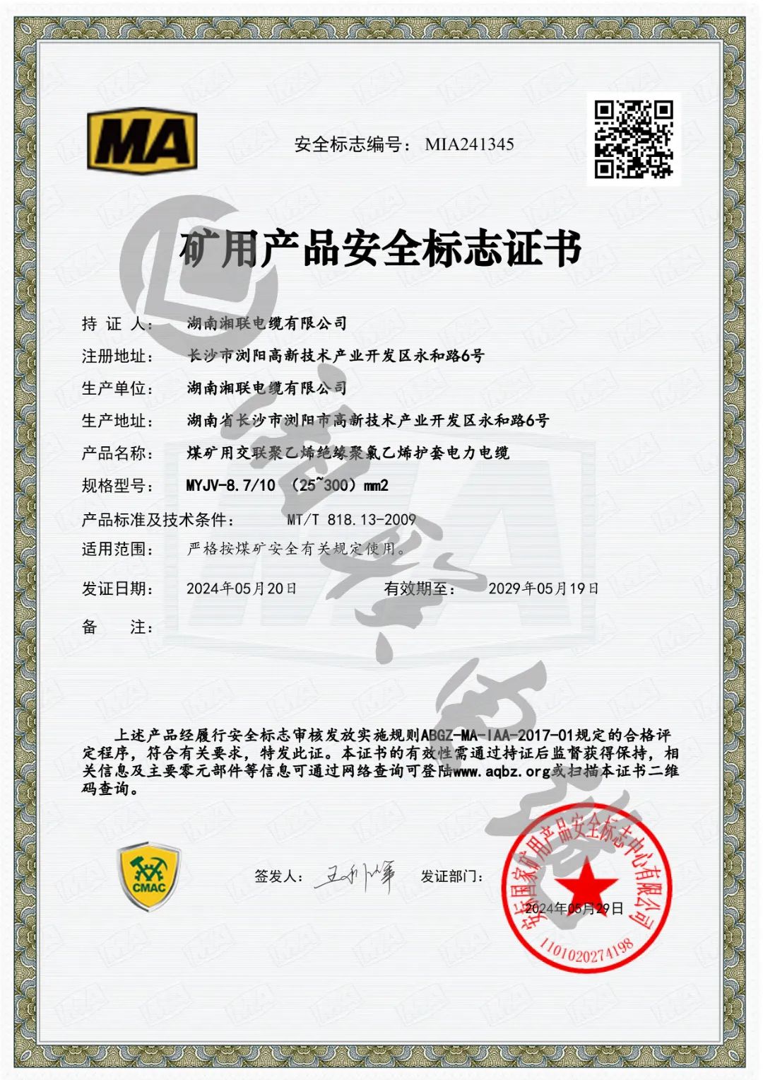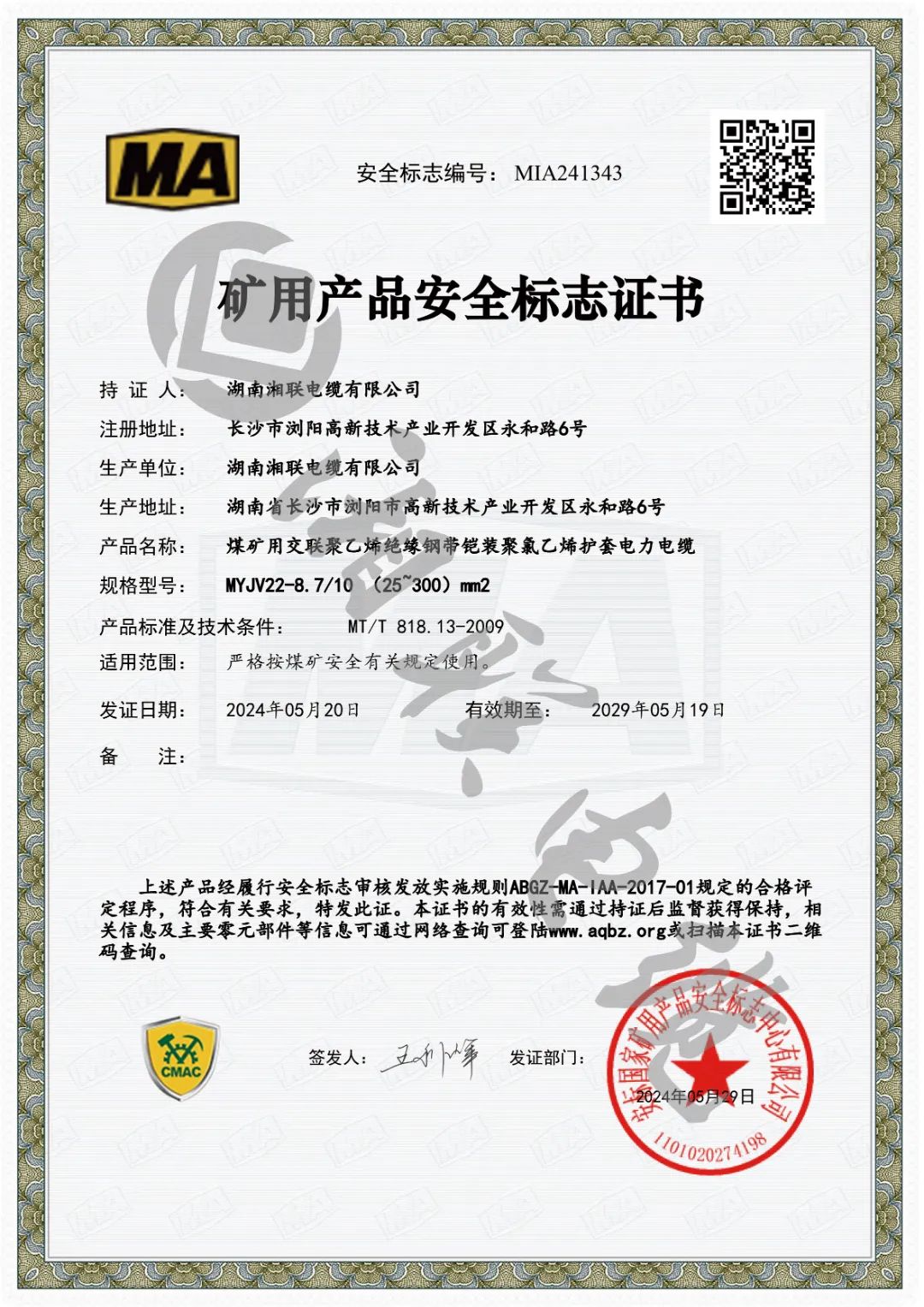 近日,湖南湘聯(lián)電纜有限公司成功取得安標(biāo)國家礦用產(chǎn)品安全標(biāo)志中心頒發(fā)MVV-0.6/1(1.5~300)mm2煤礦用聚氯乙烯絕緣聚氯乙烯護(hù)套電力電纜、MYJV-8.7/10(25~300)mm2煤礦用交聯(lián)聚乙烯絕緣聚氯乙烯護(hù)套電力電纜等六個(gè)產(chǎn)品的礦用產(chǎn)品安全標(biāo)志證書。